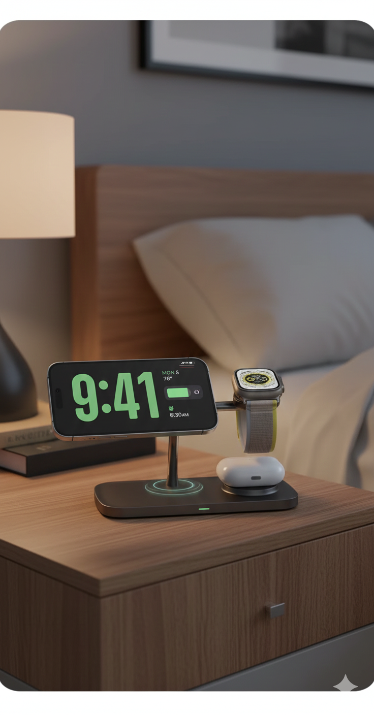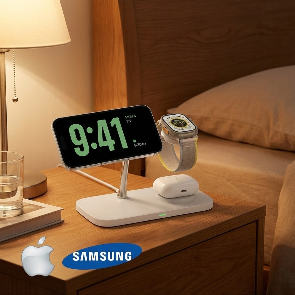 Experience the convenience of StandBy mode while your iPhone, Apple Watch or Samsung Watch, and AirPods or Samsung Buds charge overnight. Perfect for bedside use, ensuring you wake up to a fully charged and organized start to your day.
