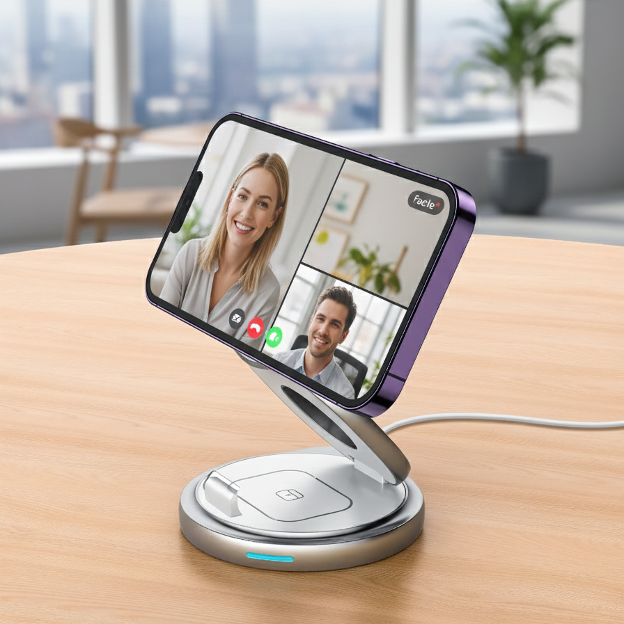 With its 360° rotating base, MagFlex® – Qi2 lets you turn your screen instantly without moving the dock itself. Perfect for video calls, screen sharing or showing content across your desk—smooth, practical and designed for daily use.