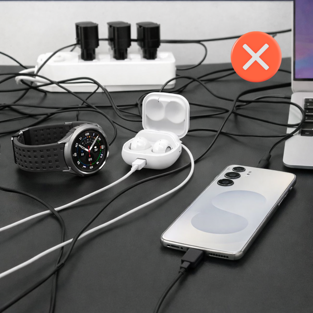 Vous connaissez cette sensation d'avoir tous ces câbles en désordre sur votre table de nuit ou votre bureau qui rendent la charge de vos appareils un vrai casse-tête ? Le DockCharger Samsungs Pro Edition offre la solution. Cette station de charge garantit que tous vos appareils Samsung sont chargés de manière ordonnée en un seul endroit. Avec son design élégant et ses puissantes capacités de charge, ce DockCharger est un accessoire indispensable pour votre (home) office ou votre chambre.