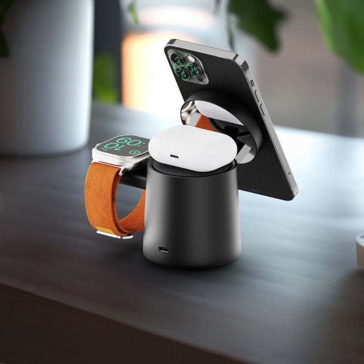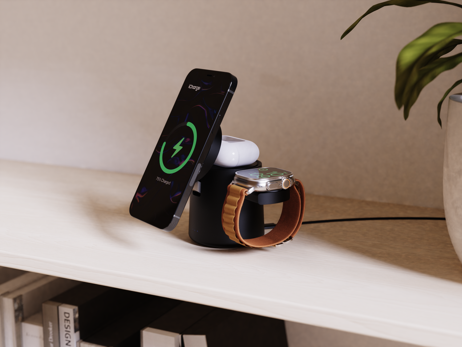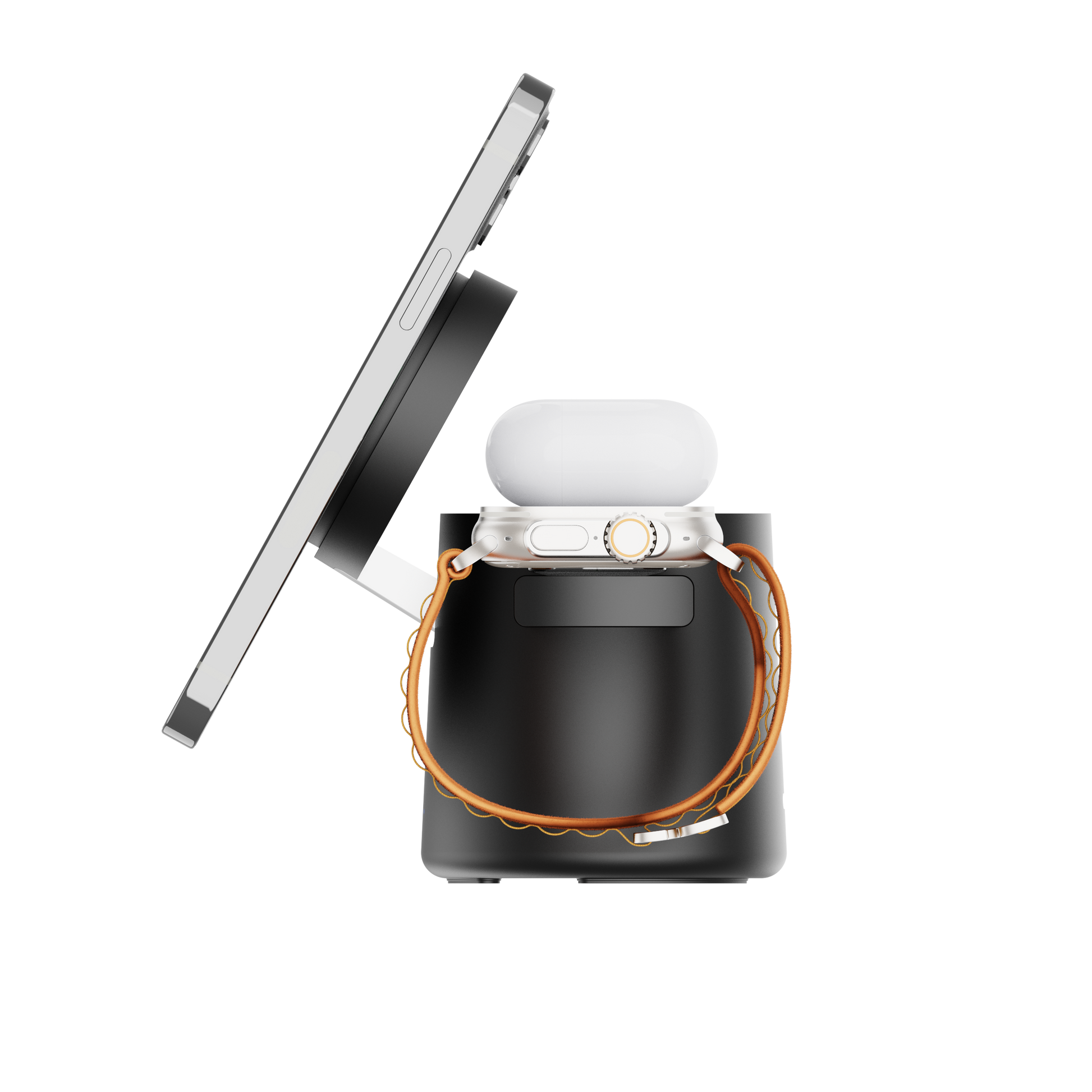 Deze 3-in-1 lader past perfect op je bureau of in je tas. Hij is klein genoeg om alles georganiseerd te houden en draagbaar genoeg om mee te nemen waar je ook gaat, waardoor opladen gemakkelijk is thuis, op kantoor of onderweg.
