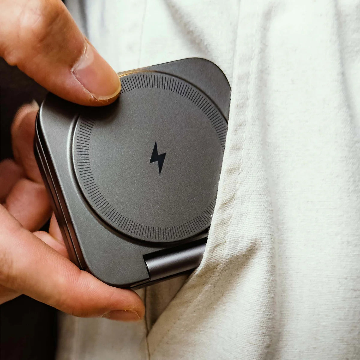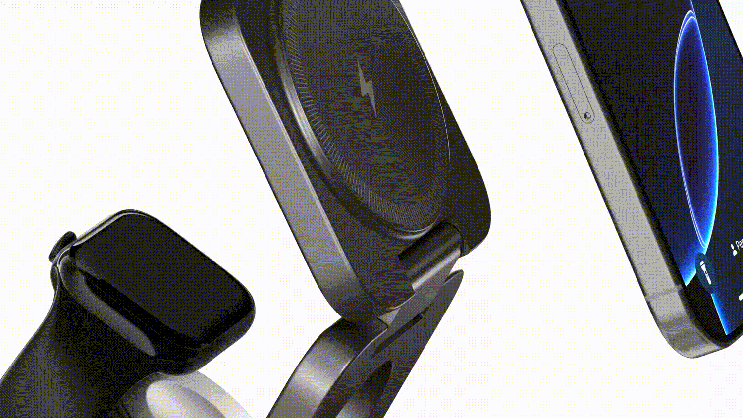 Den trådlösa 3-i-1-laddaren MagFold™ kan vikas ihop till ett smalt format i fickformat, vilket gör den lätt att bära med sig och bekväm.