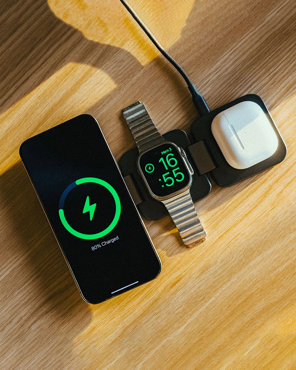 Den här kompakta laddaren är utformad för resor och håller din iPhone, Apple Watch och AirPods strömförsörjda när du är på språng. Stoppa ner den i väskan och njut av oavbruten produktivitet, vart än dina äventyr tar dig.